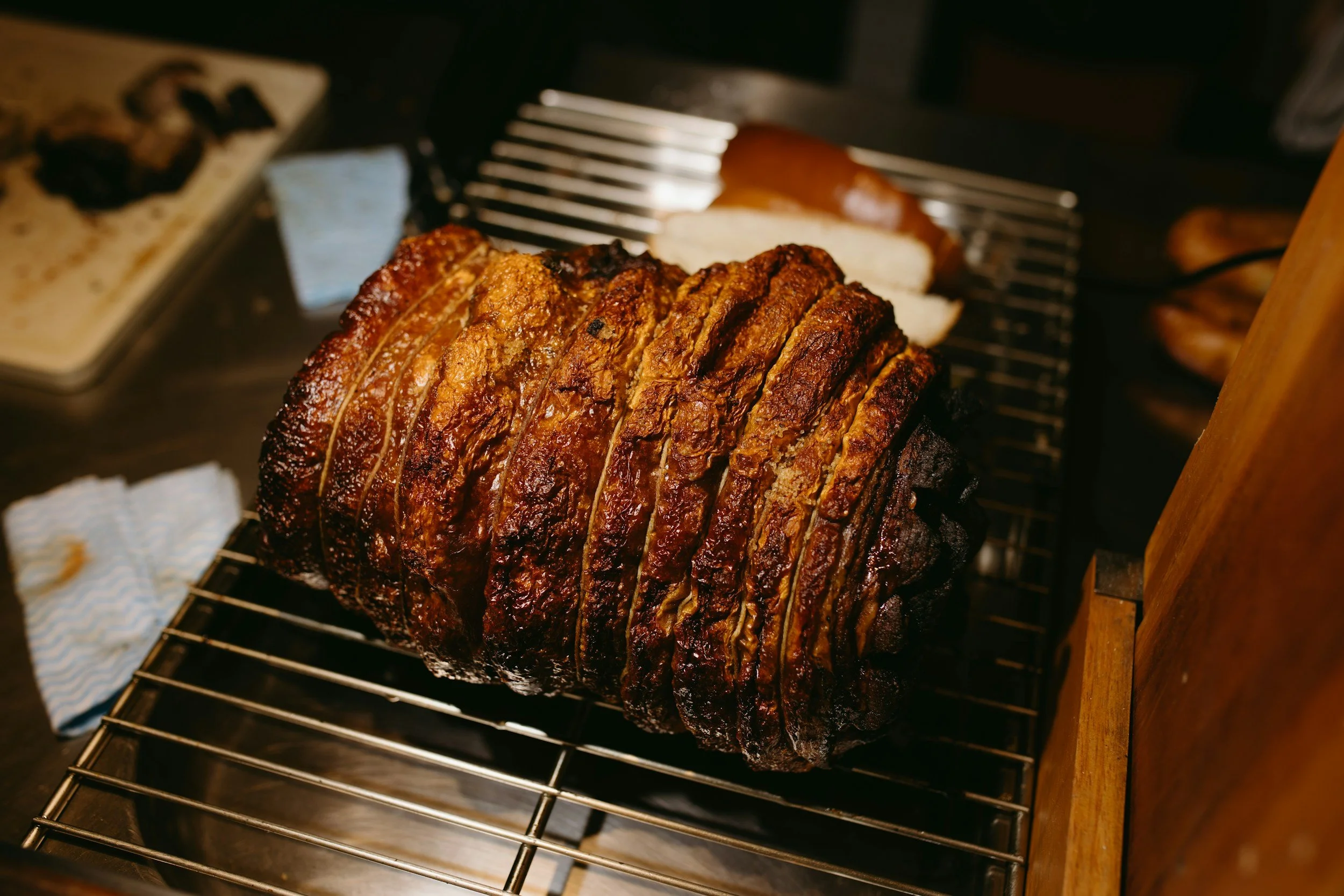 Pork belly with skin on, perfect for slow roasting to achieve crisp crackling and tender meat. Boned and rolled on request